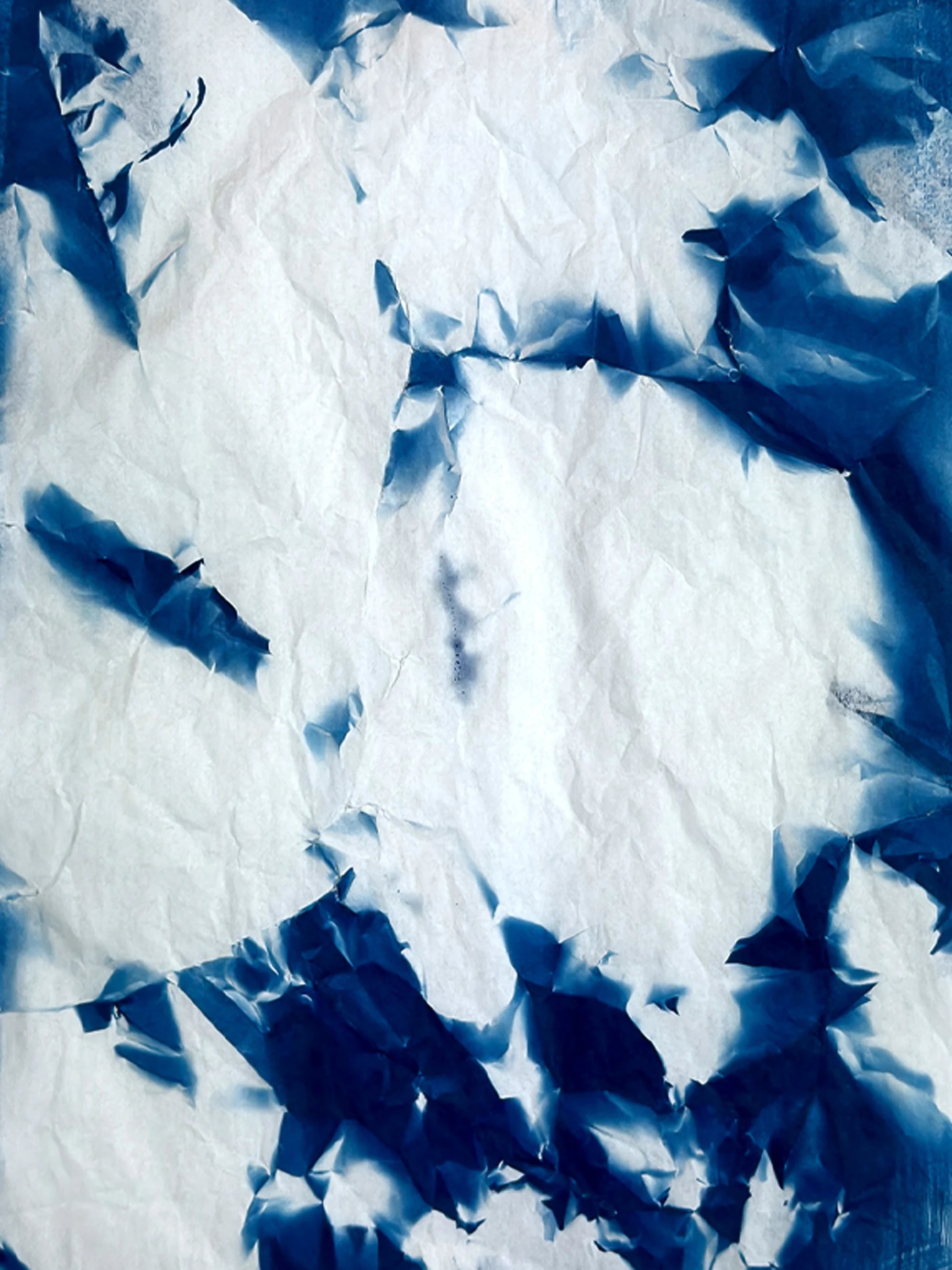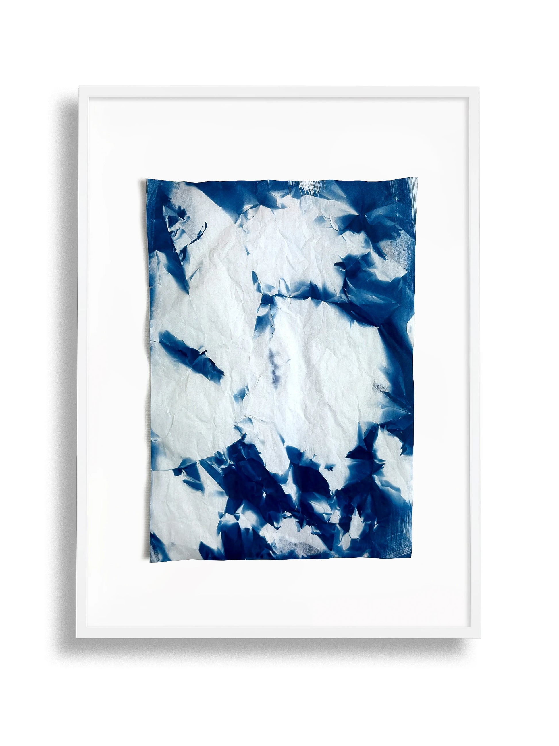 L’opera fa parte della collezione "Utòpia" - Serie "Trasparenza", in cui la cianotipia, rivisitata, viene svincolata da negativi e sagome. Sono ora le pieghe stesse della carta a generare pieni e vuoti di luce, rivelando trame inattese. Ogni lavoro è un pezzo unico, frutto di un processo che trasforma l’assenza in presenza.