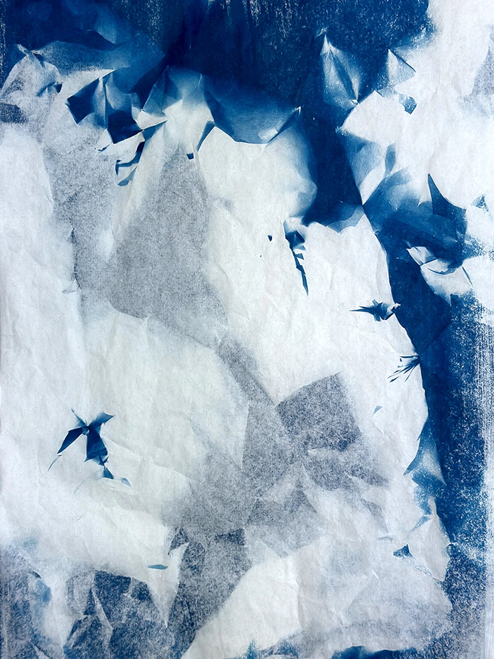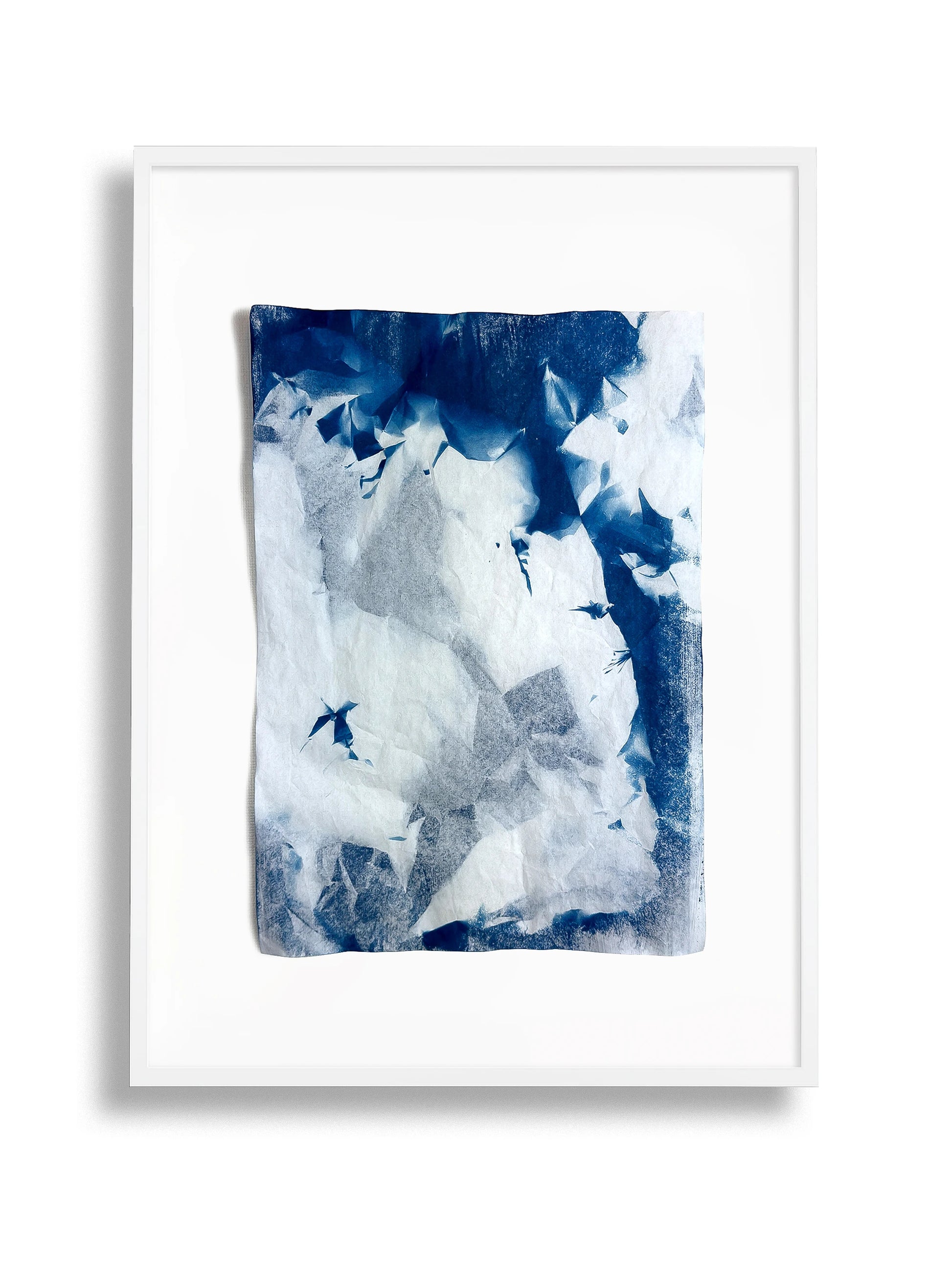 L’opera fa parte della collezione "Utòpia" - Serie "Trasparenza", in cui la cianotipia, rivisitata, viene svincolata da negativi e sagome. Sono ora le pieghe stesse della carta a generare pieni e vuoti di luce, rivelando trame inattese. Ogni lavoro è un pezzo unico, frutto di un processo che trasforma l’assenza in presenza.